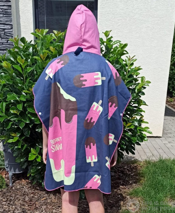 Így a gyerekek ezt a poncsót használhatják öltözőfülkeként vagy normál törölközőként, amibe bebugyolálhatják magukat úszás után. Alternatívaként a strandon is feküdhetnek rajta. Kapucnival és hurokkal rendelkezik, hogy felakaszthassa vagy becsomagolhassa a poncsót. Oldalain lecipzározható.