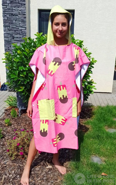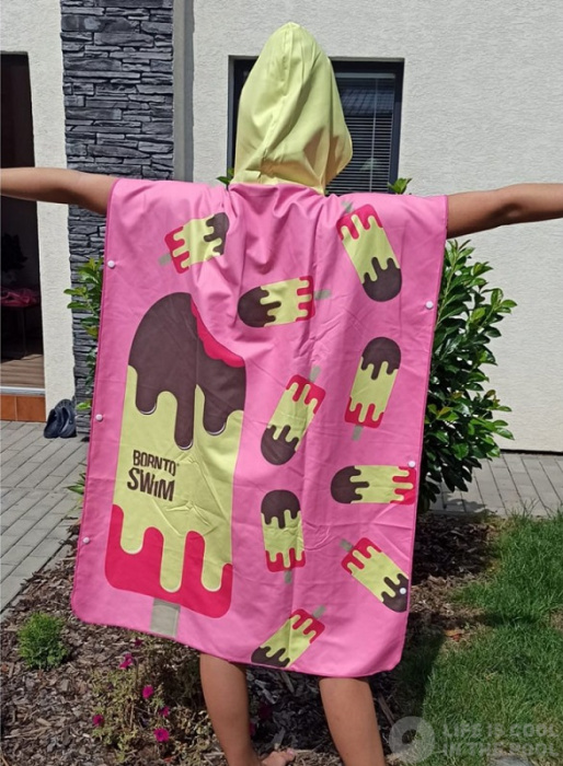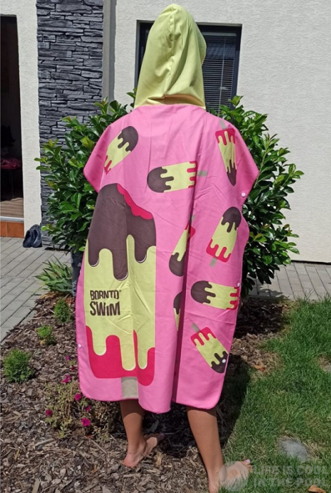 Így a gyerekek ezt a poncsót használhatják öltözőfülkeként vagy normál törölközőként, amibe bebugyolálhatják magukat úszás után. Alternatívaként a strandon is feküdhetnek rajta. Kapucnival és hurokkal rendelkezik, hogy felakaszthassa vagy becsomagolhassa a poncsót. Oldalain lecipzározható.